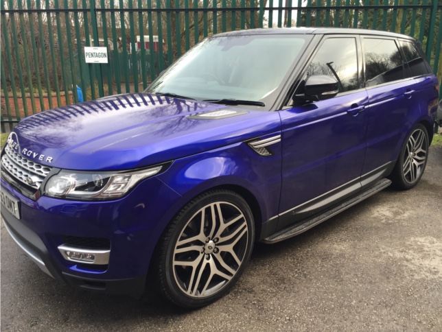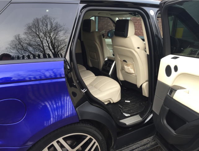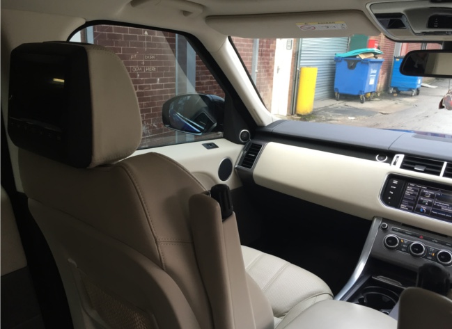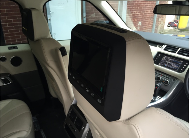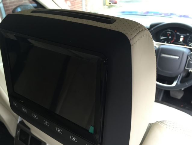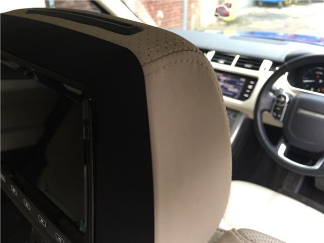 We have installed our universal headrest monitor package in this 2014 Range Rover Sport , this system replaces the factory headrests  . Each headrest has a 7 inch Widescreen Monitor with built in DVD Player & SD/USB input . We have also re trimmed the replacement headrests to match the original ones including matching the perforated section at the front .